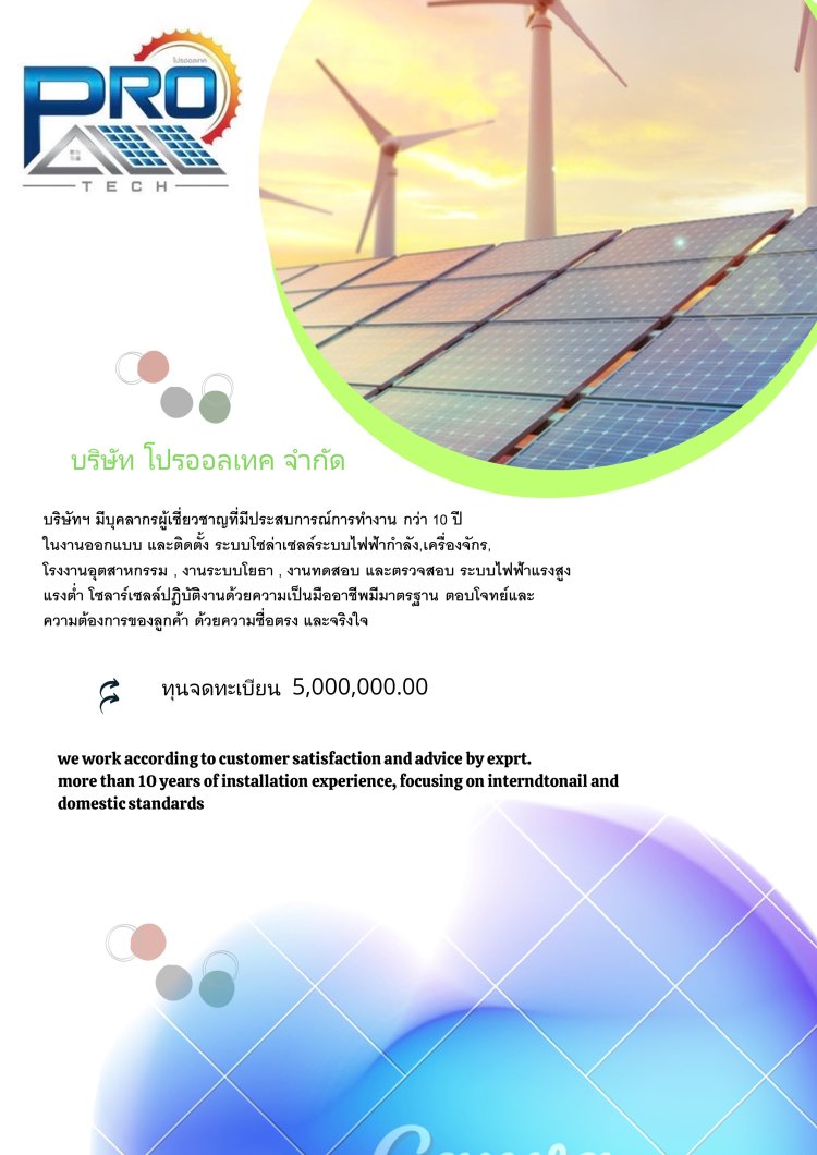 บริษัทโปรออลเทค จำกัด ผู้นำด้านโซลูชันโซลาร์เซลล์รูฟท็อปและการประหยัดพลังงานชั้นนำของไทย ที่มีผลงานการติดตั้งมามากกว่า 1,500 โครงการ ครอบคลุมมากกว่า 50 จังหวัดทั่วประเทศไทย อีกทั้งยังได้รับรองมาตรฐานบริการระดับสากล เป็นระบบโซลาร์เซลล์ราคาคุ้มค่าที่สุด ทั้งระดับครัวเรือนและโรงงานอุตสาหกรรม เลือกติดตั้งโซลาร์เซลล์กับ บิษัท โปรออลเทค จำกัด ช่วยเปลี่ยนต้นทุนด้านพลังงานให้เป็นกำไร พร้อมช่วยลดมลพิษได้อย่างยั่งยืน